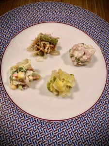 そのほかのポイントは、野菜サラダは、白菜とレタス・サニーレタスに加えトマトチョップ・ひじき・ミックスビーンズ・大根細切りを使用して、バルサミコ酢とオリーブオイルでドレスしてさらに盛り付け最後に野菜すりおろしドレッシングをかけて完成。
